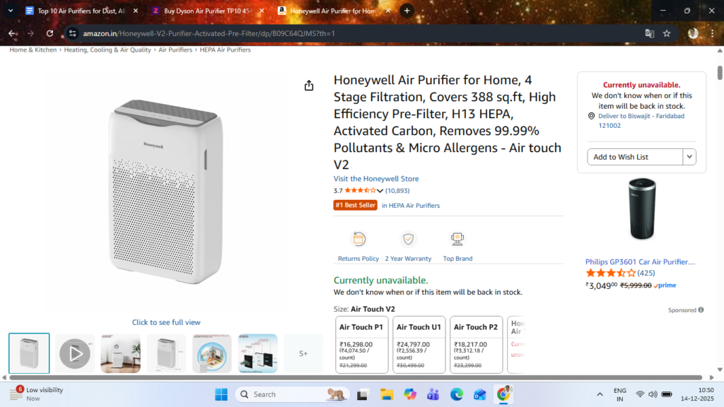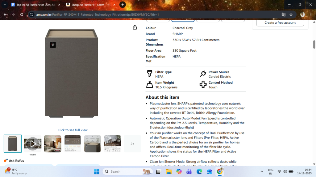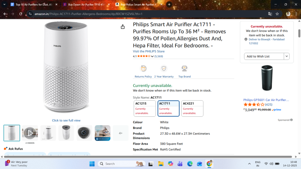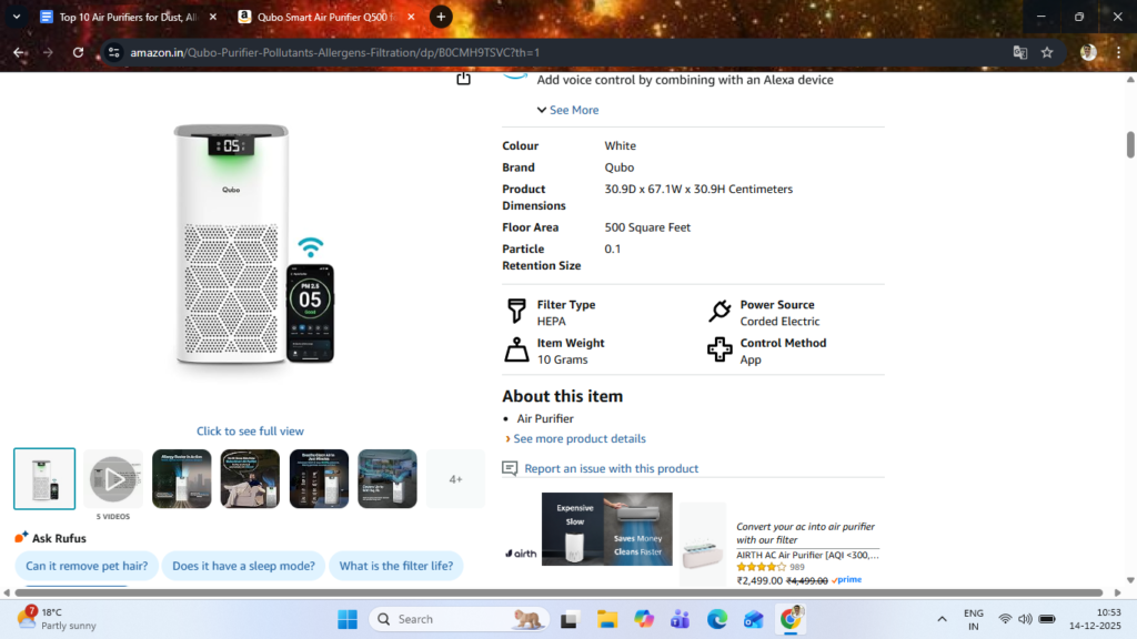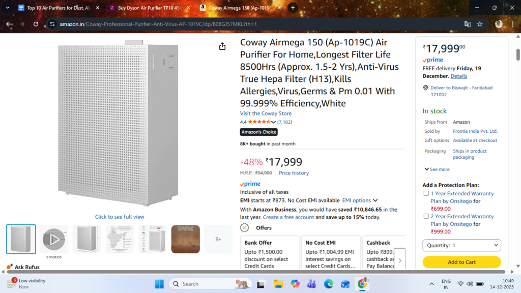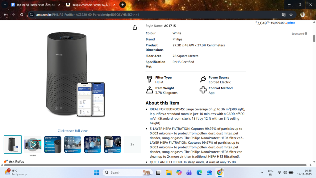 - This model often appears on Croma and Amazon with competitive pricing, making it appealing for families setting up their first serious purifier for asthma or allergy control.