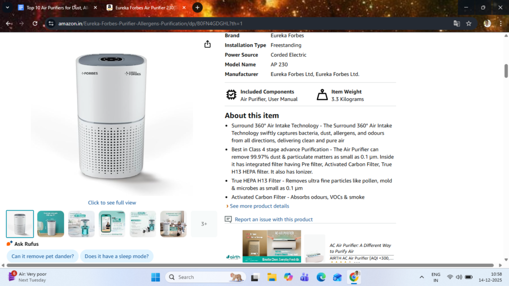 - The unit is widely available on Amazon India and is known for quiet performance and solid build quality, making it a good “set it in the corner and forget it” appliance.