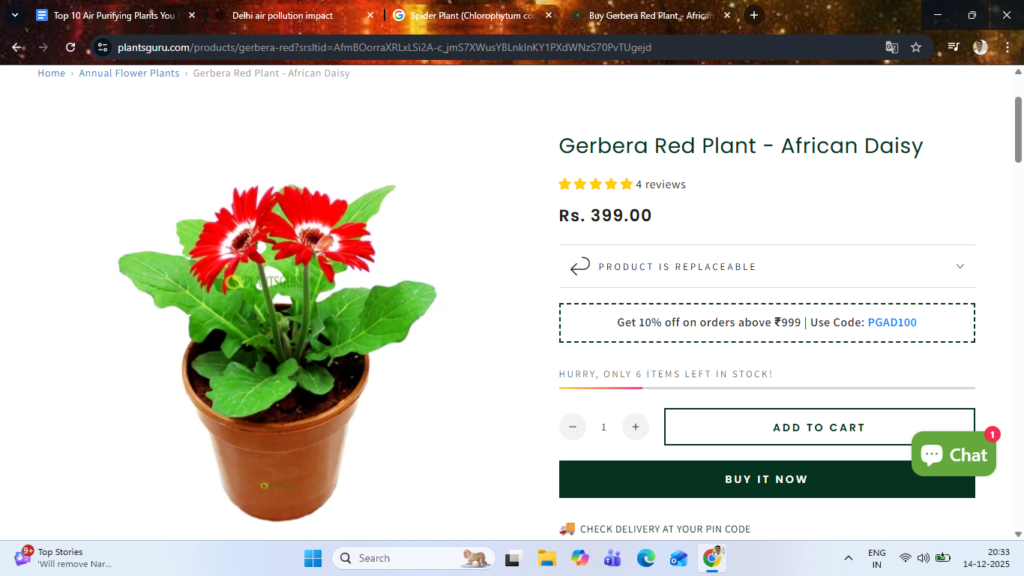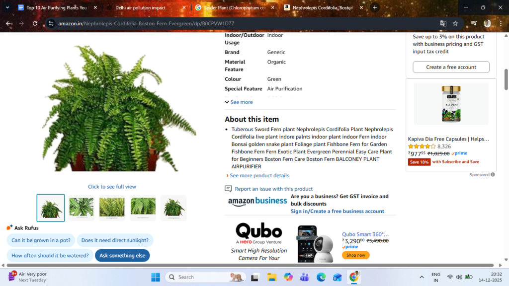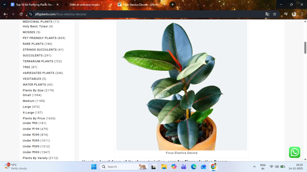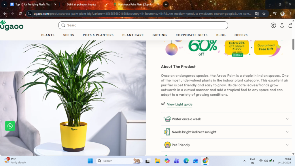 With Delhi pollution levels frequently crossing “severe” AQI (Max. AQI was 478 in Jahangirpuri and Vivek Vihar on 13th Dec 2025), indoor air can often be more toxic than outdoor air. Air purifying plants act as natural filters that complement air purifiers by;